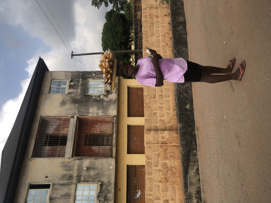 The image depicts a street scene in Ihiala, Nigeria, featuring an adult female street vendor in the foreground