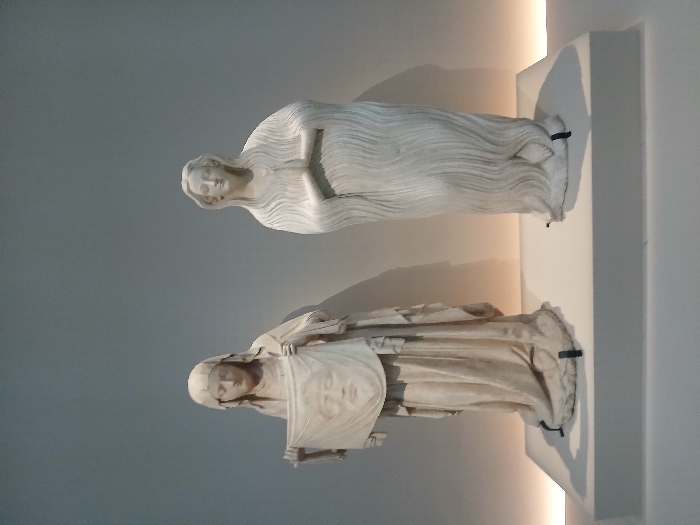 The image displays two light-colored, possibly marble or alabaster, sculptures of female figures presented on a low, rectangular pedestal within a museum setting. This scene is located in the Louvre-Lens museum in Lens, France, identifiable by its characteristic minimalist display environment and collection focus. The sculpture on the left depicts a female figure, likely Saint Veronica, standing upright. She wears long, flowing robes and a head covering that drapes over her shoulders. Both hands hold a rectangular cloth horizontally at chest level, presenting it forward. An etched or carved representation of a male face, consistent with the Holy Face of Jesus, is clearly visible on the cloth. The figure's head is slightly bowed, and her gaze is directed towards the cloth. The sculpture on the right portrays another female figure, likely Mary Magdalene. She stands with her hands clasped together at chest height in a prayerful gesture. Her body is almost entirely enveloped by long, undulating strands of hair that cascade from her head down to her feet, depicted as a garment-like texture. Her head is tilted slightly upwards, and her expression is calm. Both sculptures are positioned against a plain, light grey wall. The pedestal, also light-colored, is illuminated from beneath by a concealed light source, creating an upward glow that highlights the base of the sculptures and casts soft shadows on the wall behind them. The overall lighting is uniform and subdued, accentuating the forms of the sculptures.