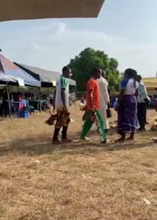 several people at an outdoor event, with a couple of them walking around holding live chickens. People are gathered under tents and in the open, some in formal attire and others in casual wear. One person is wearing a yellow shirt that reads "Our Lady of Mount Camel School". The ground is dry and covered in grass.