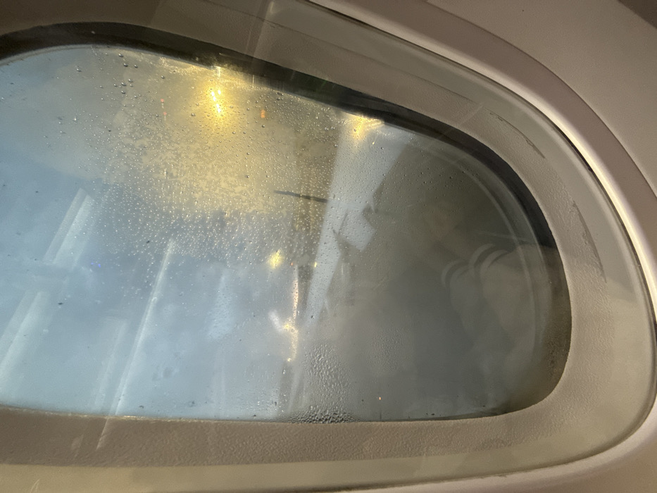 A close-up captures a window with condensation. Droplets cling to the glass, obscuring the view, although some outdoor lights are visible. The window frame is off-white and curves gently, surrounding the pane. A narrow gap is noticeable between the glass and the frame, with light reflecting across the wet surface.