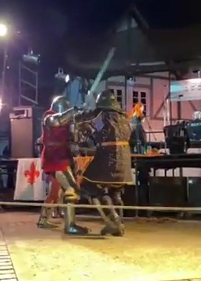 Two individuals dressed in full medieval armor engage in a sword fight on a stage. One knight wears a red tunic over his armor, while the other wears black. Sparks fly as their swords clash. The stage is lined with a low, white barrier. In the background, a band plays on a platform. The surroundings suggest a historical reenactment or festival at night, with lighting and half-timbered buildings visible. A flag with a fleur-de-lis is also visible on the stage.