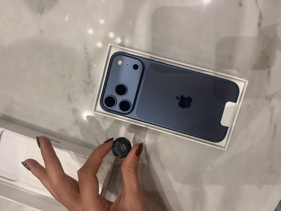 A hand holds a blueberry in front of an open iPhone box. The phone, blue in color, sits inside the box. The Apple logo is visible on the back of the phone. The box itself is white. The background is a light-colored, textured surface, possibly marble or granite.