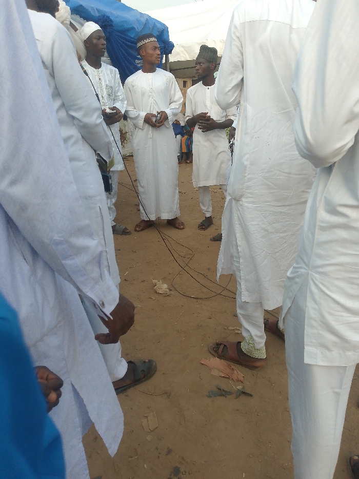 A group of men dressed in white robes and various types of hats are gathered in an outdoor setting. The men wear sandals and stand on bare ground. Some are in the background, out of focus, while others are closer to the camera and more clearly defined. A few have their hands clasped or held in front of them. Wires are visible on the ground. A blue tarp and a glimpse of additional people are in the blurred background.