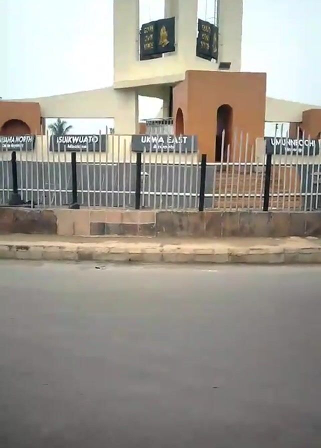 low-angle view of a monument or structure with multiple signs indicating directions to different regions: Umuahia North, Isuikwuato, Ukwa East, and Umunneochi. The structure is light-colored with some brown accents and appears to have three tall pillars. Two signs are visible at the top with the text "God's Own State." A metal fence surrounds the base of the structure, and a road is visible in the foreground. The weather appears overcast. The camera seems to be stationary and records the scene without any observable movement or interactions.
