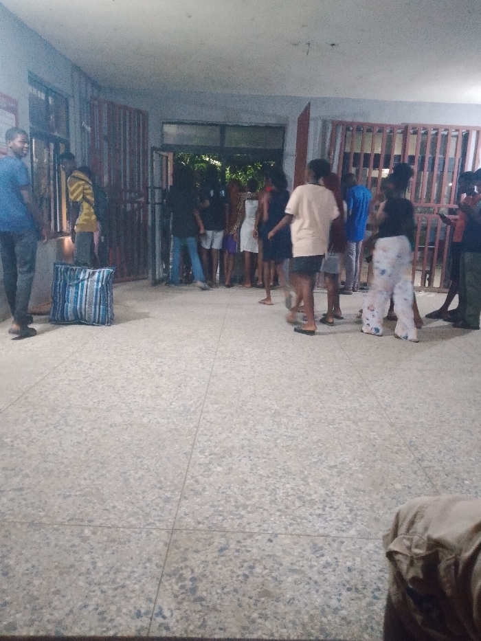 A group of people stands near a gate or doorway in what appears to be a public building. The light is dim and the picture grainy. People are scattered, some looking out the opening, others turned to the side. A striped bag rests on the floor near the left side of the image. The floor is made of light-colored square tiles. The scene is casual and potentially a gathering of individuals.