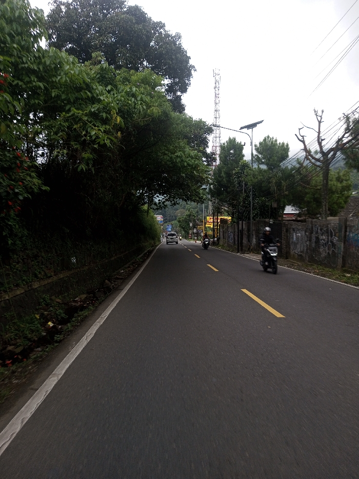 The image displays a two-lane asphalt road in Gubbisamamidi, India, viewed from a low angle under an overcast sky. The road runs generally straight before curving slightly to the left in the distance. A solid white line delineates the left shoulder, and dashed yellow lines mark the center of the road, indicating two lanes of traffic moving in opposite directions or a single lane each way. On the road, a black motorcycle with a rider wearing a helmet is prominent in the right foreground, moving away from the viewer. Further down the road, a white four-door passenger car is visible in the left lane, also heading away. Another motorcycle follows the white car in the distance. The left side of the road features a steep, densely vegetated embankment covered in dark green foliage, with hints of red flowers among the leaves. A concrete drainage ditch runs along the base of this embankment. The right side of the road is bordered by a concrete wall displaying dark, irregular markings. Behind this wall, several pine trees and other sparse vegetation are present. A utility pole equipped with a solar-powered street light stands vertically on the right, with overhead power lines extending across the frame. In the mid-ground on the right, a tall, metal lattice telecommunications tower is visible against the light grey sky. Distant hills or mountains are discernible through the atmospheric haze and trees.