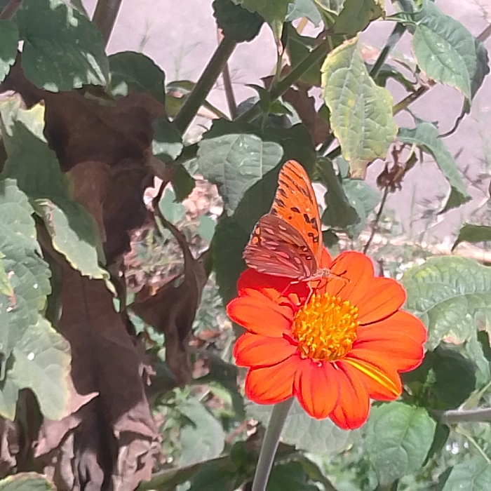 An orange butterfly with black markings is perched on the vibrant yellow center of an orange, daisy-like flower. The butterfly's wings are partially folded upwards, revealing a lighter, spotted underside on its left wing and a brighter, striped upper surface on its right wing. The flower has numerous orange petals radiating from its yellow central disc and is supported by a green stem. The surrounding environment consists of dense green foliage, including leaves and stems, with some darker or brownish areas. The scene is outdoors, brightly illuminated by sunlight. This event occurred in Juan Griego, Venezuela.