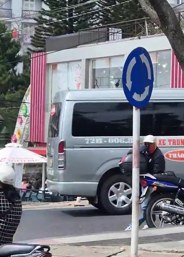 The video depicts a street scene in front of a Lotteria restaurant. A silver van drives by the camera's left, while a roundabout sign stands prominently next to a parked blue motorcycle. A person wearing a yellow hat and light-colored clothing is seen dancing in the middle of the sidewalk, moving with exaggerated gestures. Other people are visible sitting at tables under white umbrellas outside the restaurant. A tree is on the right side of the frame, partially obscuring the view.