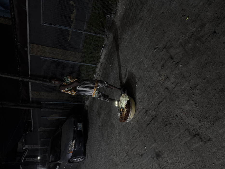 A person stands near a car, alongside a road or paved area with a bag, possibly containing goods. The individual wears a patterned shirt and shorts. It's a nighttime shot with limited lighting, casting shadows on the ground. The area seems to be a parking space near a building with a fence. The car is a dark color.