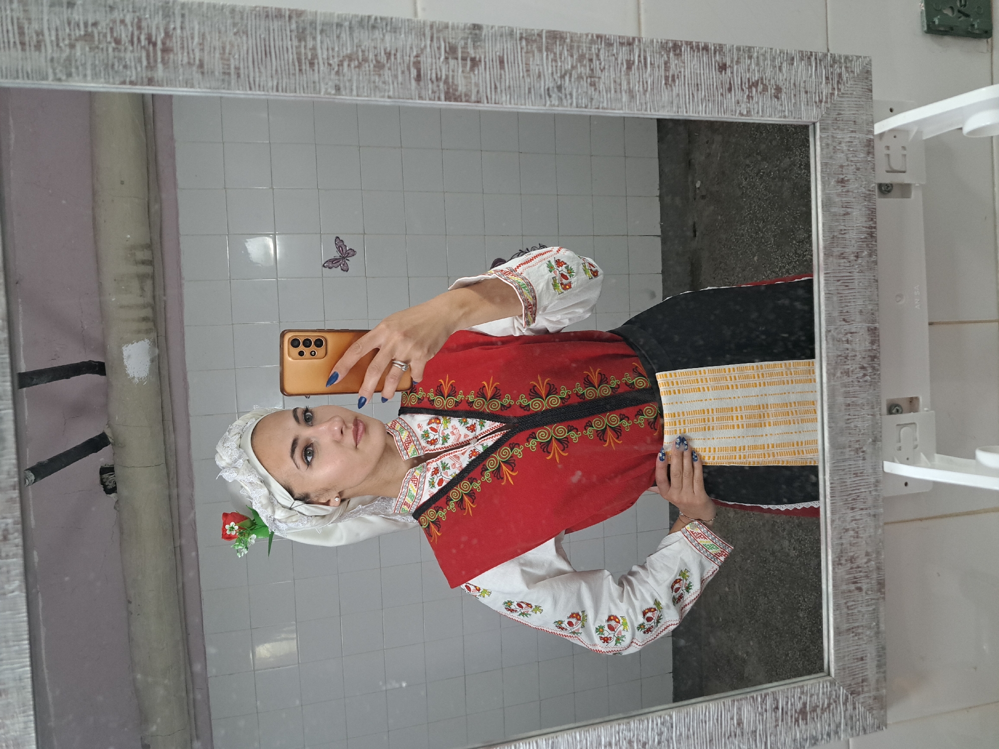 - "The image is a reflection in a framed mirror of a woman dressed in traditional Bulgarian folk costume, taking a selfie with her smartphone" by FM-9hQ1C3, licensed under CC BY 4.0