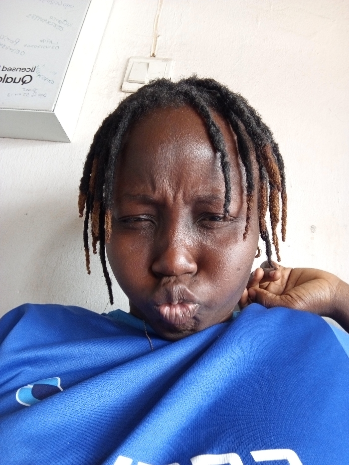 A medium close-up portrait shows an individual with dark skin and dark dreadlocks, some strands containing brown highlights. The individual's lips are pursed and puckered, eyes are partially closed with wrinkles at the outer corners, and the forehead is furrowed. They are wearing a blue short-sleeved garment with a light blue and white graphic on the left chest area, and a thin gold-colored chain is visible on the neck. The right hand, with fingers curled, rests near the right ear. The background is a plain light-colored wall. A white rectangular panel, bearing faint, inverted text including "Quali," is mounted on the upper left wall. A white electrical switch or outlet is mounted on the upper right wall, with a thin white wire extending from above it. The scene is located in Fagge A, Nigeria.