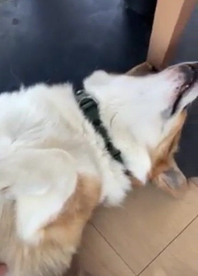 corgi lying on its back on a light-colored wooden floor and a dark, possibly slate, table. A hand wearing a black sleeve strokes the dog's white stomach. The corgi wears a green collar and has white and tan fur. The camera focuses on the dog's face as it lies with its mouth slightly open, displaying its teeth. A wooden table leg is also in the frame.