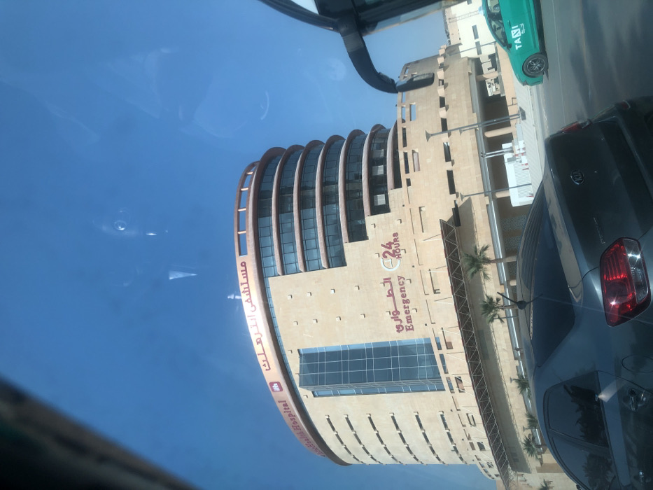 A modern, beige-colored hospital building with a rounded facade dominates the view, featuring multiple rows of windows. An "Emergency 24 Hours" sign is visible in Arabic and English. A grey car occupies the right side of the frame, while a green taxi is partially visible at the top. The clear blue sky is seen above. A vehicle's interior, possibly a windshield, appears in the upper left corner.