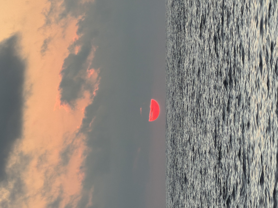 An ethereal landscape is vertically presented. To the left, clouds transition from peach to gray. A blood-red sun, partially obscured, hangs centrally. To the right, a turbulent body of water churns with white-capped waves under a somber sky. The colors are muted, creating a surreal, almost apocalyptic scene. The horizon line is sharply defined between the sky and the sea.