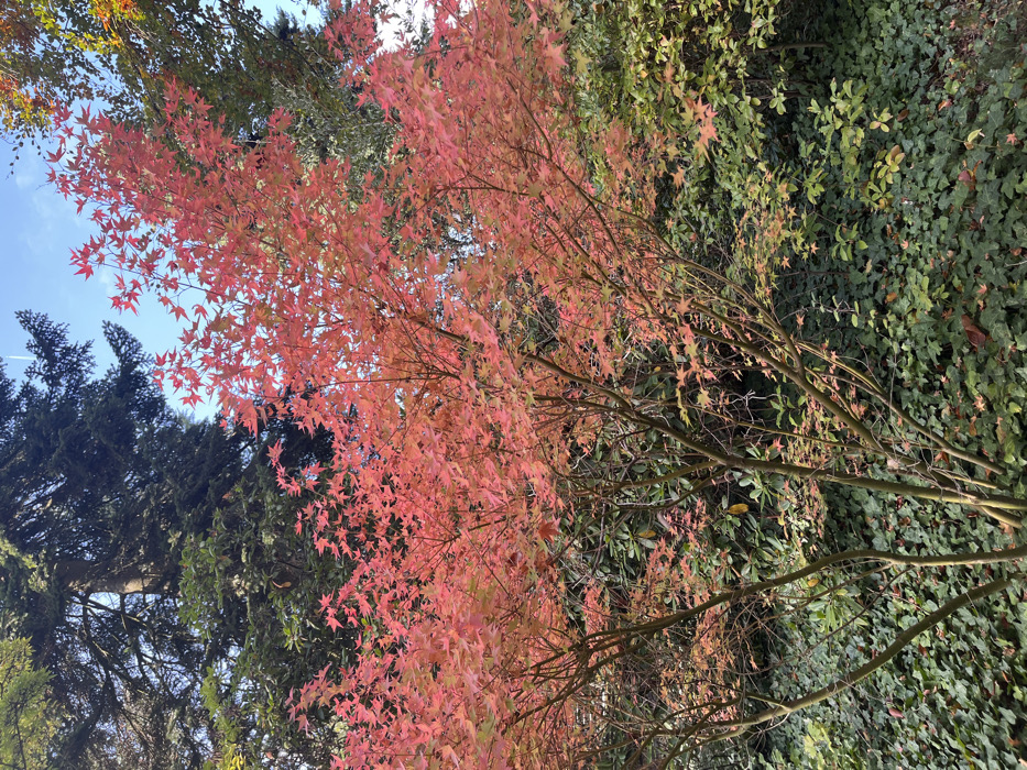 This image depicts an outdoor natural scene in Mulhouse, France. A prominent deciduous tree, identified by its multi-stemmed structure and dense canopy of vibrant red and orange five-lobed leaves, consistent with a Japanese maple in autumn, occupies the central and left-mid ground. Bare branches are visible through the foliage. In the upper background, dark green coniferous trees are positioned on the left, while other green and yellowish broadleaf trees are visible on the right. The upper sky is clear blue with a faint white contrail. The ground in the foreground and lower background is densely covered with dark green ivy and various other low-lying green shrubs. No individuals, animals, actions, interactions, or artificial objects are present.