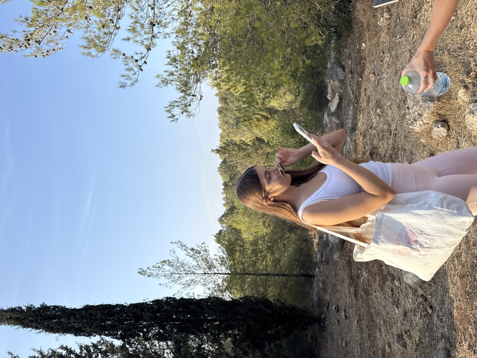 The image depicts a natural, forested outdoor environment under a clear blue sky, likely in the late afternoon or early morning due to warm lighting. A female individual, appearing young, stands centrally. She possesses long, straight, brown hair and wears a white tank top and light pink leggings. A light-colored canvas tote bag, featuring a pink graphic of crossed tennis rackets and the text "BEVERLY HILLS ATHLETICS," is slung over her left shoulder. She holds a white smartphone vertically in her left hand and a pair of dark-lensed sunglasses in her right hand, positioning them near her face while looking at the phone screen. In the lower right corner, the bare forearm and hand of a second individual are visible, extending into the frame. This hand holds a clear plastic water bottle with a green screw-on cap, appearing to offer it. The ground consists of dry, uneven earth with scattered small rocks and sparse, light brown vegetation. Tall, dark green columnar evergreen trees are prominent on the left side of the frame. On the right, pine trees with visible pinecones on their branches are present. The background is composed of a dense forest of various green trees and shrubs. The sky above is uniformly light blue and clear. This scene is consistent with a natural, forested area or green space within the vicinity of Modi'in-Maccabim-Re'ut, Israel, characterized by Mediterranean flora and terrain.