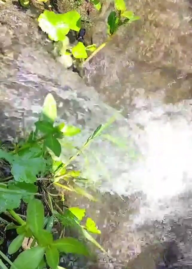 small, shallow stream of water flowing over rocks. Green plants grow along the edges of the stream. The water is clear, and the sunlight reflects off the surface, creating a bright glare. The camera angle is from above, looking down at the stream.