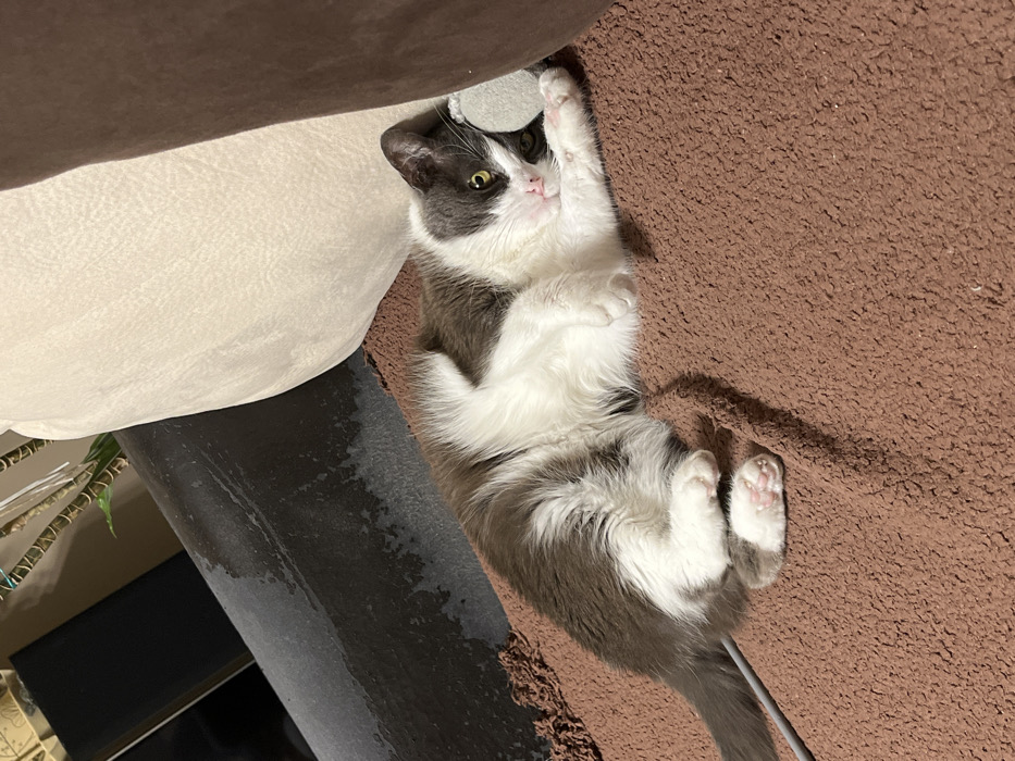 - "A domestic short-haired cat, exhibiting a white and gray bicolored coat, is depicted lying on its right side on a rust-brown, textured fleece blanket" by FM-W4GQK2, licensed under CC BY 4.0