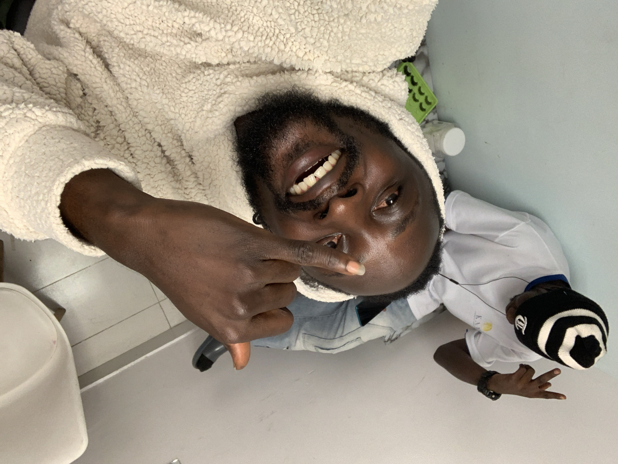 The image, rotated 90 degrees clockwise, depicts two adult males indoors in what is stated to be Lekki, Nigeria. The foreground subject is a dark-skinned male with a beard, wearing a cream-colored, textured hooded garment and light blue jeans. He is smiling broadly, exposing his teeth. His right hand is extended towards the camera, with the index finger pointing towards his face. A dark-colored mobile phone is visible in his left jeans pocket. Behind and to the left of the foreground subject is a second dark-skinned male, oriented with his head facing away from the camera. He wears a white short-sleeved shirt with a partial logo (e.g., "K.A.") on the left chest, a black and white striped beanie hat, and a black wrist-watch on his left wrist. Wired earphones are visible, entering his ears. His left hand is raised, performing a gesture with the index and pinky fingers extended. The floor is composed of light grey tiles. In the background, the leg and base of a white chair are visible. On the floor, near the second subject's head, rests a white bottle with a white cap and a green plastic tray featuring multiple small, semi-circular indentations. The scene is brightly and uniformly lit, consistent with an indoor environment.