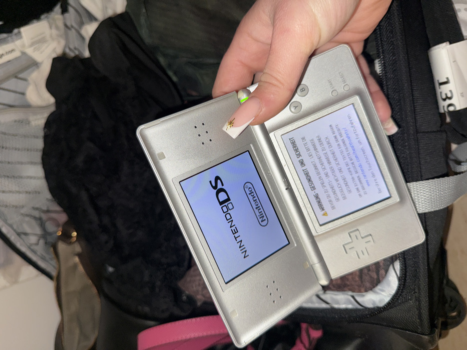 The image displays a silver Nintendo DS handheld gaming console held by a person's right hand, viewed from a slightly elevated angle. The console is open and powered on. Its upper screen shows "NINTENDO DS" and "Nintendo®" on a light blue background. The lower touchscreen displays a German language warning message regarding health and safety, instructing the user to touch the screen to proceed. The right hand features manicured nails with a white French tip style and a small gold star-shaped decal on the thumbnail; a green power indicator light is visible near the console's right hinge. The background consists of a cluttered open suitcase or travel bag, containing various items of dark clothing, possibly black lace or patterned fabric, and a partially visible pink object on the far left. A light grey strap, likely from the bag, is visible at the bottom, along with a tag displaying numbers, including "139". While the console displays German text, there are no discernible visual cues within the image to forensically identify a specific location within the city of Cologne, Germany.