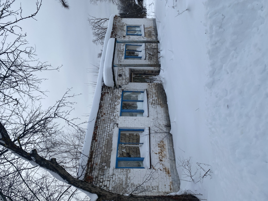 A dilapidated, two-story brick building with blue-framed windows stands in a snow-covered landscape under a gray sky