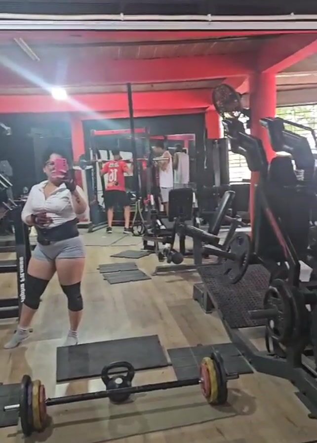 reflection in a gym mirror of a person taking a selfie. The person is standing to the left of a barbell, wearing a white top, grey shorts, a waist belt, knee pads, and sneakers. They are holding their phone in their left hand, presumably to take a picture of themselves. In the background of the gym, other people are working out on various weight machines. The gym has wood-look flooring, and the walls are primarily black and red. The lighting is bright.