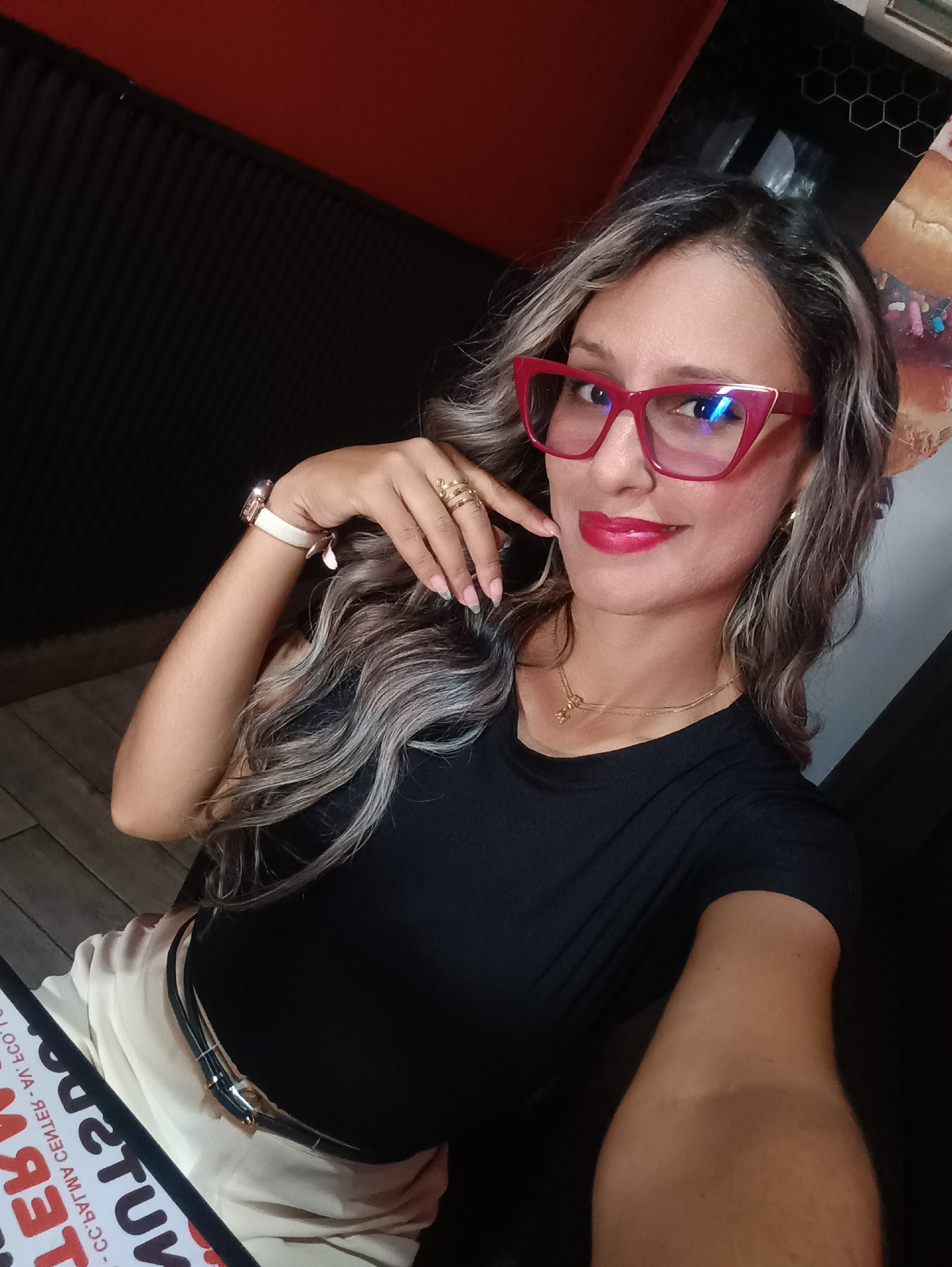 The image depicts an adult female engaged in a selfie, situated indoors within a commercial establishment in La Victoria, Venezuela, specifically identified as "CC. Palmas Center" via reflective text on a table. The female, positioned centrally, presents a frontal view, gazing directly at the camera with a subtle smile. She possesses medium-toned skin and long, wavy, multi-toned hair, dark with prominent blonde/grey highlights, cascading over her shoulders. She wears red, cat-eye style eyeglasses with reflective lenses, red lipstick, and small gold-colored hoop earrings. A thin gold-colored necklace with a small pendant is visible around her neck. Her right hand, adorned with multiple gold-colored rings and long, French-manicured nails, is raised and lightly touches her hair near her temple. A white-strapped watch with a rose gold-colored casing is on her left wrist. Her attire consists of a black short-sleeved top, light-colored (possibly beige or cream) high-waisted bottoms, and a black belt with a gold-colored buckle. The background on the left features a dark, vertically ribbed wall section and a solid red wall above. The right side of the background displays a promotional image or poster, partially showing a donut with sprinkles and a portion of a hamburger bun, against a dark surface with a hexagonal pattern. A reflective table surface in the bottom-left foreground shows inverted red text, clearly indicating "CC. Palmas Center. La Victoria."