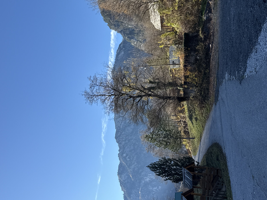 The image depicts a rural mountainous landscape in Bistrica, Montenegro, under a clear blue sky. A paved, dark grey road curves from the lower left towards the center, transitioning to a gravel surface in the lower right. On the left side of the road, two wooden structures with gabled roofs are partially visible. The midground features a mix of vegetation, including two prominent green coniferous trees, a large deciduous tree with bare branches centrally located, and other trees exhibiting autumnal foliage (yellows, browns). A light-colored recreational vehicle (RV) or camper is situated behind a low concrete wall and dense vegetation on the right side of the road, with a utility pole nearby. Further to the right, a house with a light-colored roof is partially visible amidst trees. The background is dominated by a range of rugged, dark grey mountains with forested slopes and visible rock formations. The sky above is a vibrant blue with a faint, wispy white cloud visible near the left mountain peak. No individuals, animals, or specific actions are observed within the scene.