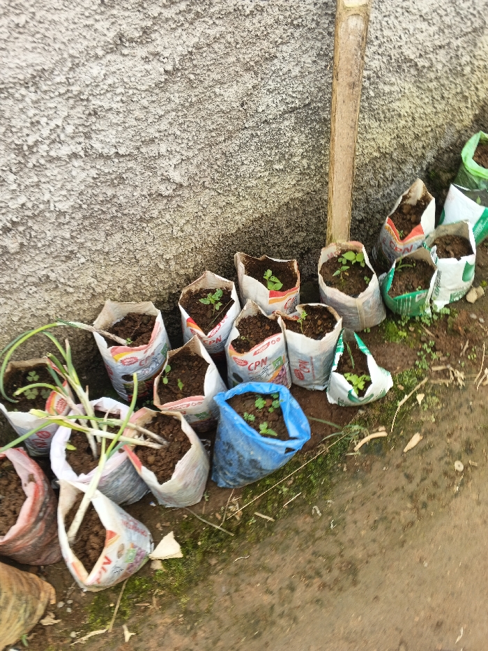 A collection of small plants sits in makeshift pots near a textured wall. The pots appear to be repurposed bags of various colors, filled with soil. Some bags bear the label "CPN". Small green sprouts emerge from many of the pots, while others hold what seem to be onions. A thin wooden stick stands beside some of the potted plants, and a dirt path runs along the edge of the scene.