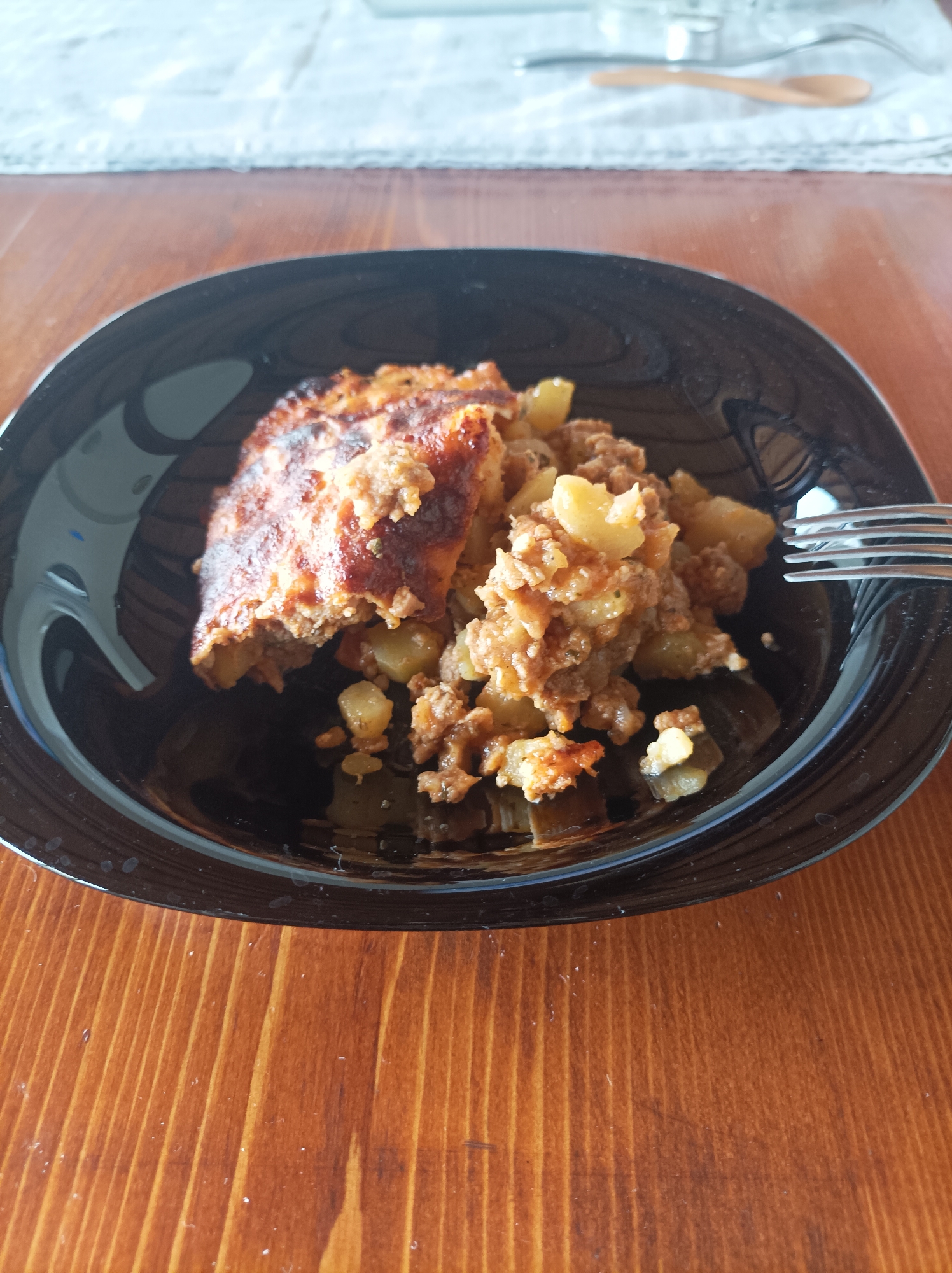 The image presents a close-up, high-angle view of a meal served on a black, square-edged plate with a glossy finish. The food item consists of a baked dish featuring a browned, crusted surface on one portion, suggestive of a casserole, accompanied by a mixture of granular brown ground meat and irregularly diced yellow-white vegetables, possibly potatoes, with some minor green inclusions. A four-tine silver-colored metal fork is partially embedded within the food on the right side of the plate. The plate rests on a polished wooden surface displaying distinct parallel grain lines in a reddish-brown hue. In the out-of-focus background, a light-toned, textured fabric, likely a placemat, is visible, supporting blurry objects including a clear glass, a small light-colored wooden spoon, and an additional silver-colored utensil. The scene depicts an indoor dining setting in the city of Reselets, Bulgaria.