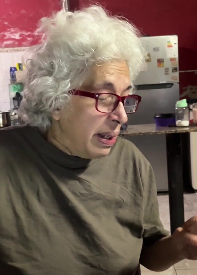 An elderly woman with white curly hair and red-framed glasses is the main subject. She is wearing a brown t-shirt. She is in what appears to be a kitchen, indicated by the presence of a refrigerator, a table with various items on it, and a red wall. The woman appears to cough and then wipes her mouth.