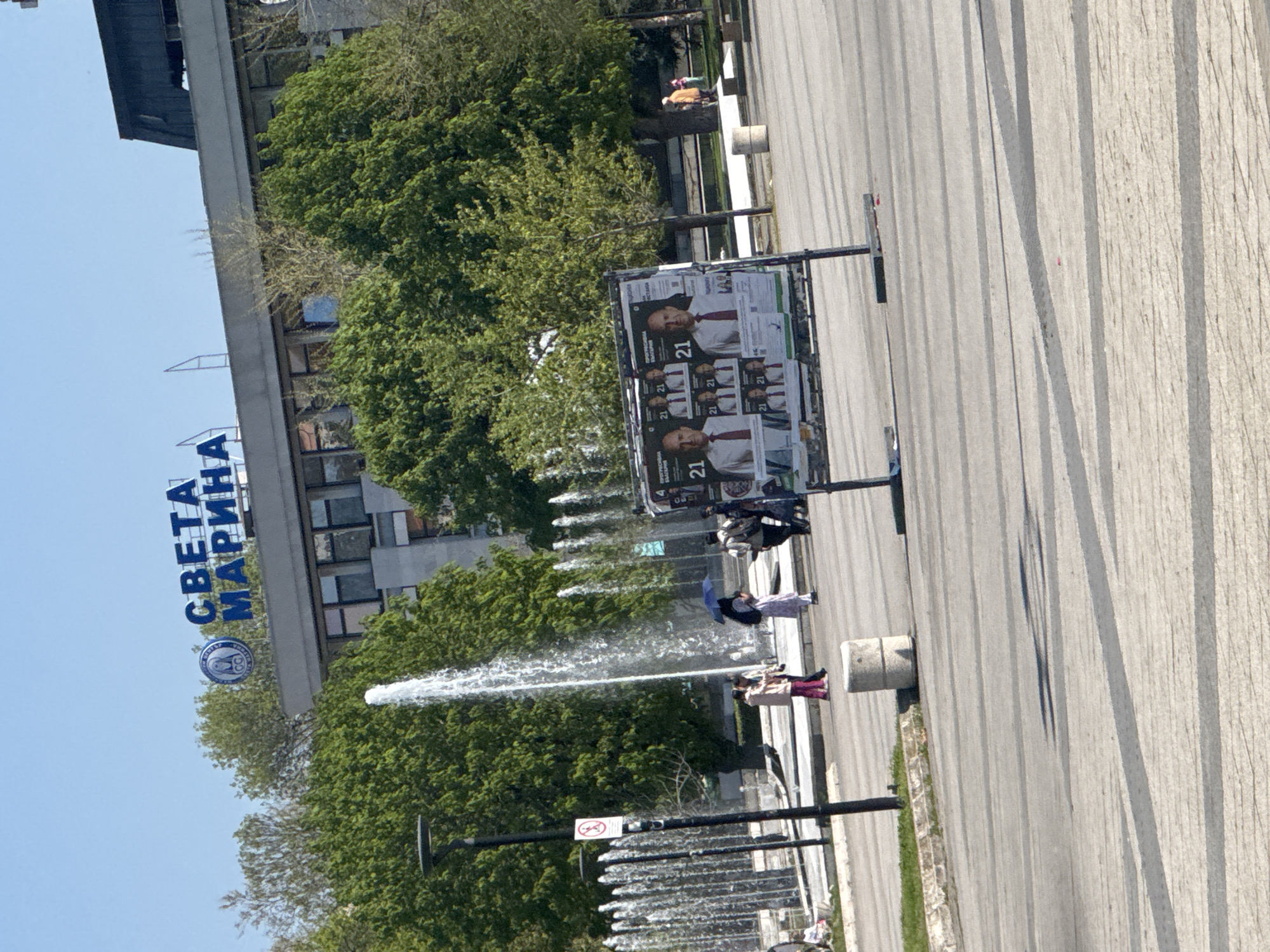 scene in Pleven, Bulgaria, likely a public square or plaza. In the foreground, there are water fountains shooting upwards. There's a large advertisement billboard displaying posters of a man, with the number "21" prominently featured, suggesting a political campaign or event. People are walking in the vicinity of the fountains. In the background, a building is visible with a sign in Cyrillic script that reads "СВЕТА МАРИНА". The building is surrounded by trees, suggesting it might be a park or a green space surrounding the building. The weather appears sunny. The ground is paved with textured concrete.