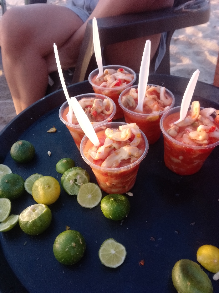 The image displays a dark, possibly plastic, tray positioned on sandy ground in an outdoor setting, likely a beach. Six clear plastic cups, each filled with a red, liquid-based seafood cocktail containing white and pale orange shellfish (such as shrimp or octopus) and a white plastic spoon, are arranged on the tray. Scattered across the tray are approximately ten whole green limes, several cut lime halves (some appearing squeezed), two whole yellow lemons, and various detached lime/lemon seeds and pulp fragments. In the upper left background, the lower torso and legs of an individual wearing light-colored shorts are visible, seated in a dark chair. The location is an unknown city, unknown country.