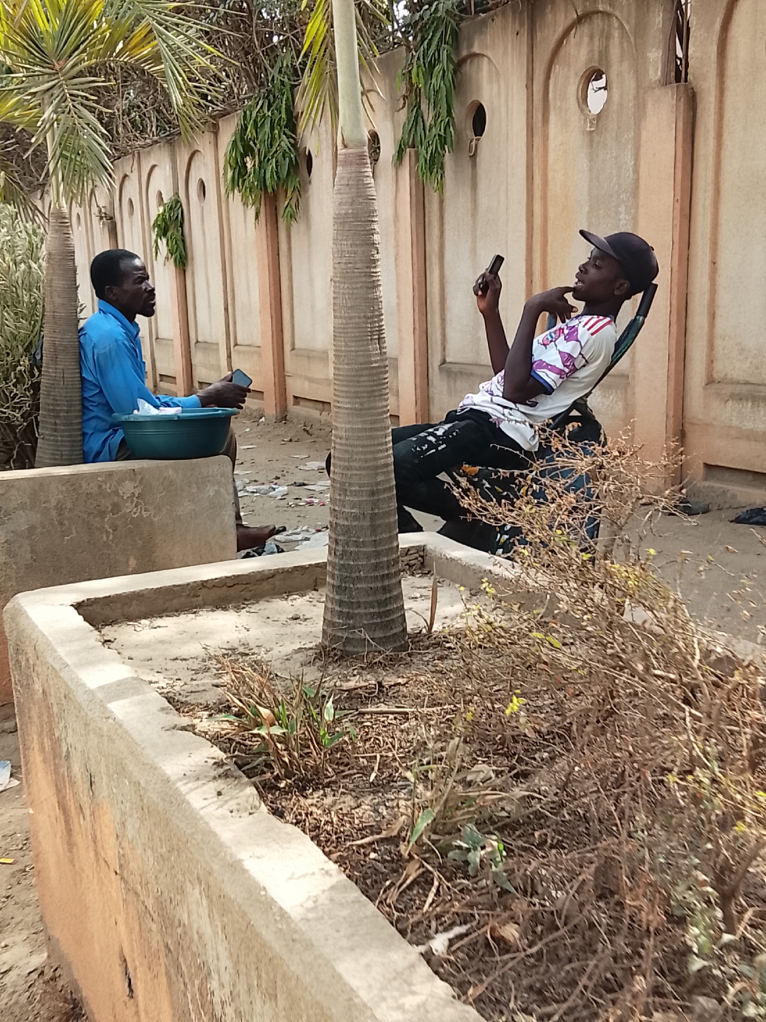 The image, likely taken in Abuja, Nigeria, depicts two men outdoors alongside a beige wall with arched recesses and small circular openings. The environment shows elements of both nature (trees, shrubs, a planter box containing dry vegetation) and urban life (paved ground, litter). On the left, a dark-skinned man wearing a blue long-sleeved shirt sits on what appears to be a concrete structure. He holds a mobile phone in his left hand, while his right hand rests on a turquoise bowl placed on his lap. He is barefoot, with only one foot visible. On the right, another dark-skinned man in a black baseball cap, a patterned white t-shirt, and dark pants sits in a chair, leaning back. He is also holding a mobile phone and appears to be looking at it thoughtfully, with his right hand under his chin. A tall palm tree trunk is prominently positioned between the two men and slightly in the foreground. The planter box containing dry vegetation partially obscures the lower part of the seated man on the right. Litter is scattered on the ground near the wall.