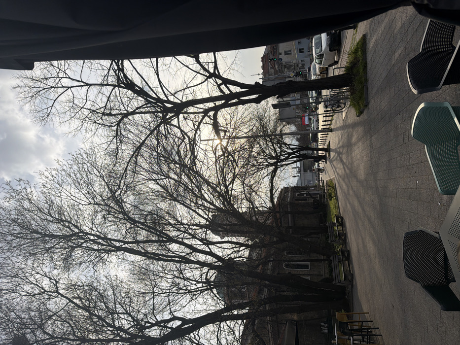 The image captures an outdoor urban scene in Plovdiv, Bulgaria, viewed from a slightly elevated position, likely a cafe patio, facing east towards the Church of Saints Constantine and Helena. In the immediate foreground, the bottom portion of a table surface is visible. Two empty outdoor chairs are positioned facing away from the viewer: one dark teal-green and one dark grey-black, both featuring patterned seats. A dark, vertical fabric element, possibly an awning or curtain, occupies the far right edge of the frame. The midground is dominated by a paved pedestrian pathway with light-colored rectangular paving stones, stretching into the distance. Numerous bare deciduous trees with dark, intricate branches line the pathway and stand in front of the church, silhouetted against the bright sky. These trees cast prominent, elongated shadows across the pavement, indicative of a low sun angle. To the left of the pathway, a small grassy area contains at least two empty park benches made of dark wood slats and metal frames. The most prominent architectural feature is the Church of Saints Constantine and Helena, a large stone building with multiple domes, a central bell tower, and arched windows, partially obscured by the trees. Further down the pathway, two individuals are visible, walking away from the viewer; one appears to be riding a bicycle. A street light pole is present on the right side of the path, with the sun's rays creating a starburst effect behind it. Near the curb, a bicycle rack holds one parked bicycle, separated from the adjacent road by a line of dark metal bollards. The background includes a multi-lane road on the right, with vehicle traffic, including a white sedan in the lane closest to the viewer. Traffic lights, displaying green signals, are visible above the road. Beyond the road, various urban buildings line the street, and faint outlines of distant hills or mountains are discernible against a partially overcast sky with bright sunlit patches. The overall lighting is bright, with strong contrasts between sunlit areas and deep shadows.