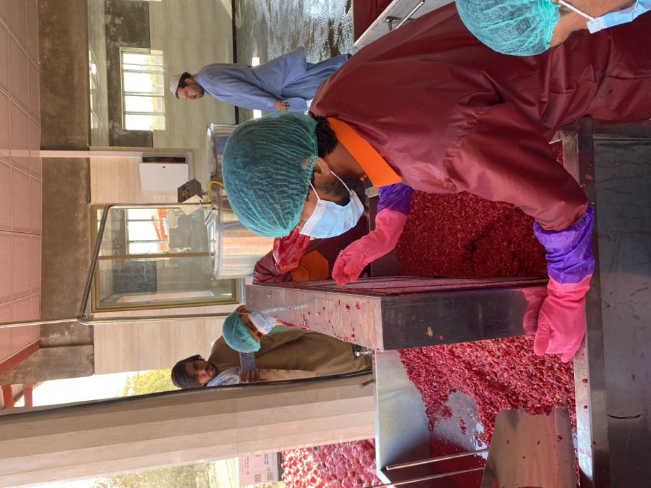 People wearing protective gear, including surgical caps, masks, and gloves, are gathered around a large stainless steel container filled with ground meat