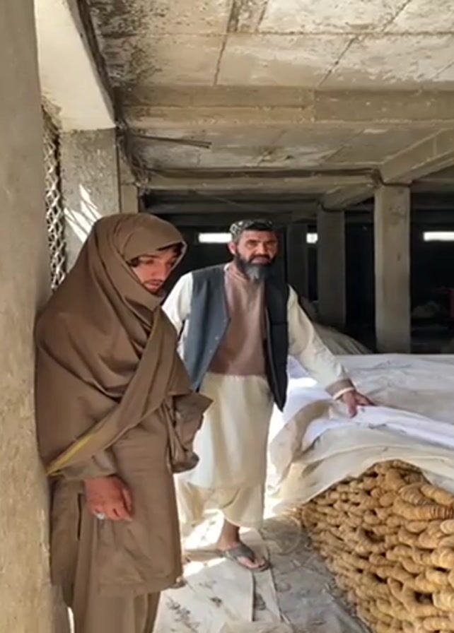Two men stand in a dimly lit warehouse-like structure with concrete pillars and a corrugated metal ceiling. The younger man on the left is partially covered in a tan shawl, his eyes are looking to the side. The older man on the right has a gray beard and a cap on his head. He wears a vest over a light-colored traditional outfit. Behind them is a large pile of what appear to be burlap sacks. A white tarp partially covers the stack. The older man is looking at the camera, his hand resting on the white tarp. The overall atmosphere is austere and utilitarian.