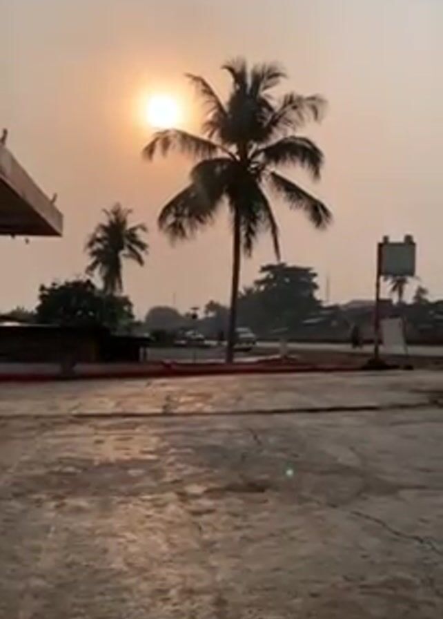 The video presents a static shot of a scene at ground level, capturing the early morning or late afternoon as the sun appears low in the sky, partially obscured by the haze