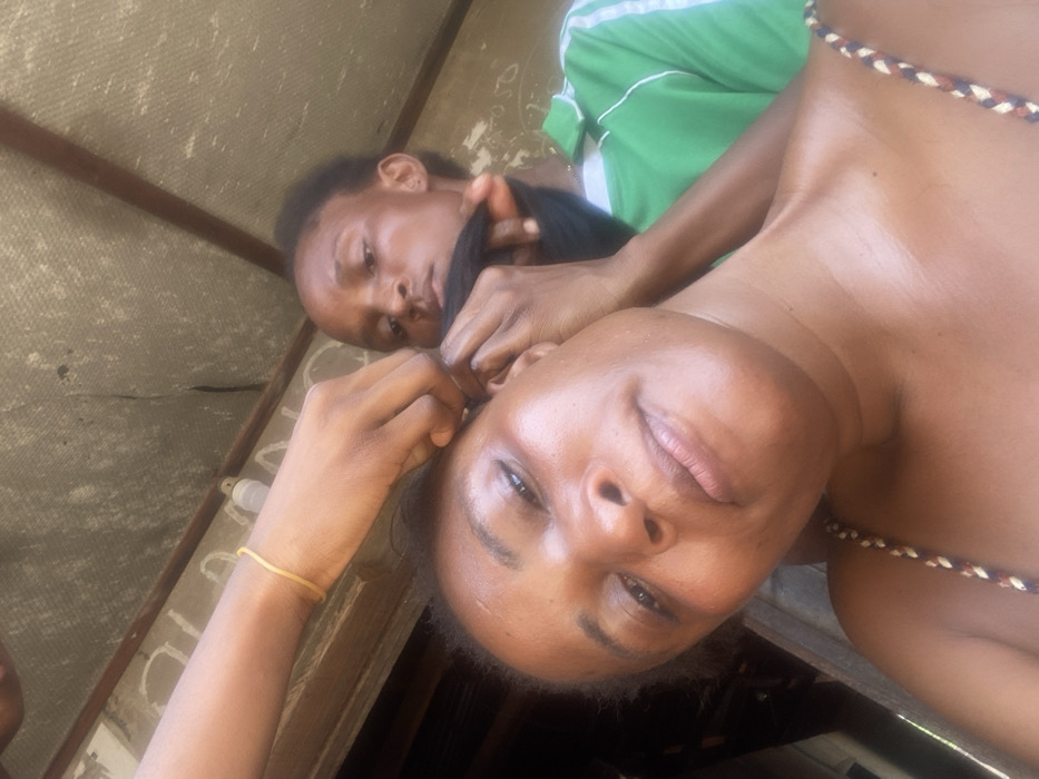 An image taken in Idiroko, Nigeria, depicts three individuals engaged in hair braiding under a corrugated roof