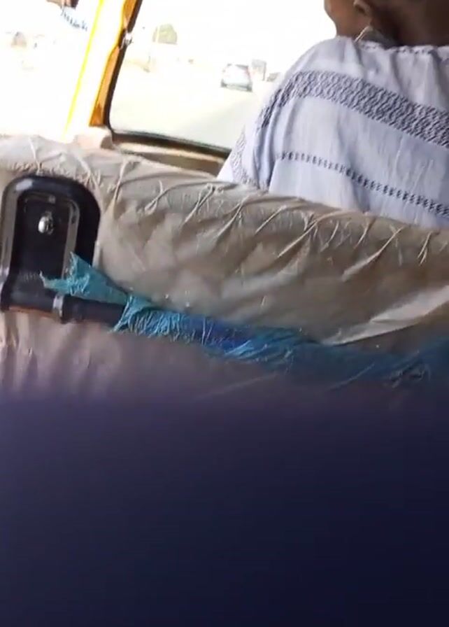 The video depicts the inside of a yellow motorized tricycle, likely a tuk-tuk, moving along a paved road. The viewpoint is from the back seat, focusing on the back of the driver, who is wearing a light blue striped shirt. The seat in front of the viewer is covered with a grey protective cover and has blue plastic wrapping underneath. Through the front window, other vehicles, including a car and a motorcycle, are visible on the road. The interior of the tuk-tuk has a patterned ceiling. The focus is primarily on the passenger's perspective within the moving vehicle.