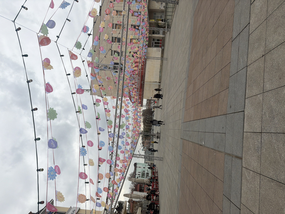 The image depicts a public square or pedestrian street in Plovdiv, Bulgaria, identified as likely being Knyaz Alexander I Street near the Central Post Office, indicated by the architecture and signs. The scene is captured on an overcast day, with a uniformly grey sky. The ground is paved with large, rectangular tiles in shades of grey and reddish-brown, arranged in a grid pattern. Above the square, a dense network of black cables strung with string lights and numerous colorful, flower-shaped banners extends across the entire visible area. Many banners display Cyrillic text, notably "БАЗАР" (Bazaar). These overhead decorations are supported by visible metal truss structures. On the left side of the frame, an outdoor cafe area features multiple red tables and chairs, occupied by approximately 5-7 individuals dressed in coats. Behind the cafe, a multi-story building with a white facade and a partial "MetLife" sign is visible. To the right, a prominent, multi-story building with a light-colored, possibly stone or concrete facade features multiple windows. Near its base, a sign with Cyrillic text is visible, including "МАРКЕТ ПОНЕДЕЛНИК" (Market Monday). A large, red structure, also displaying "БАЗАР," extends from this building towards the center of the square. Approximately 10-15 other individuals are distributed across the paved square, walking in various directions, singly or in small groups. No direct interactions among pedestrians are clearly discernible. The overall activity level is moderate.