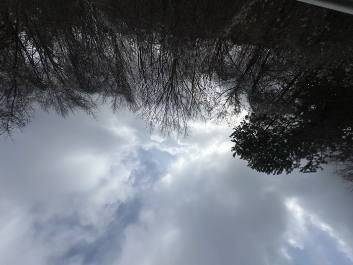 The image depicts an outdoor natural landscape in Gintsi, Bulgaria, under an overcast sky with some visible blue patches. The lower two-thirds of the frame are filled with a dense canopy of trees and shrubs, viewed from a low angle. On the far left, a dark green conifer, possibly a pine or fir, is visible with dense foliage. Adjacent and extending across the majority of the frame are numerous deciduous trees and shrubs, all appearing bare of leaves, indicating a winter or late autumn season. Sparse, light-colored material, consistent with snow or frost, adheres to some of the lower branches and shrubbery. The upper third of the image consists of a sky dominated by varying shades of gray clouds, with brighter areas suggesting diffused sunlight and several breaks revealing sections of blue sky, particularly towards the upper-center and upper-left. No human subjects, animals, or prominent artificial structures are present.