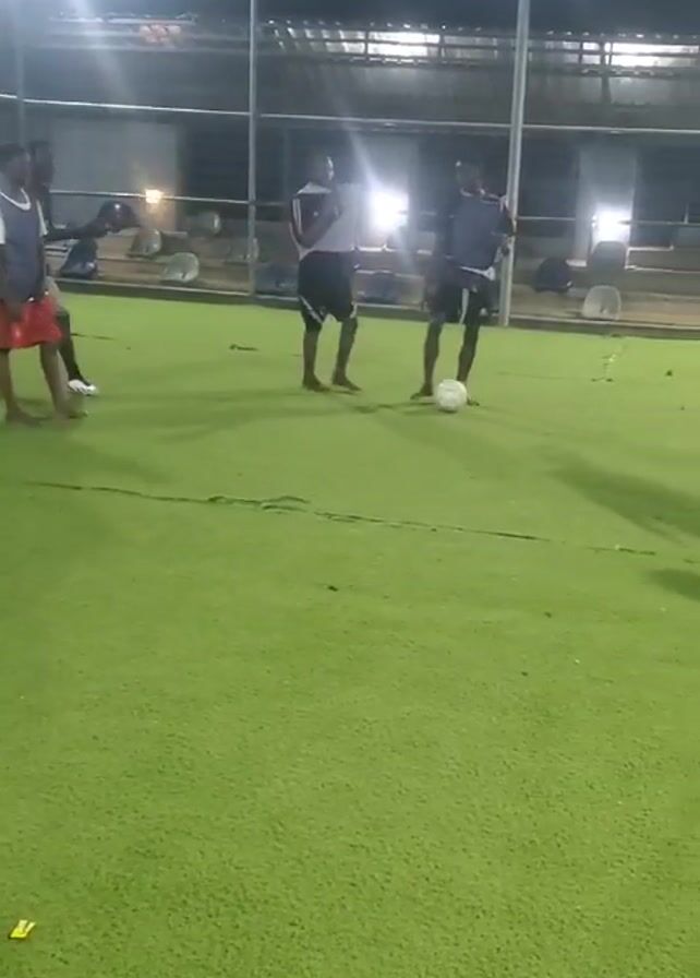 group of men playing soccer on an artificial turf field at night. The field is surrounded by a net enclosure and lit by overhead lights. There are five men visible in the frame, some are barefoot and others are wearing shoes. They are kicking and passing a soccer ball, with some men carrying their shoes in their hands. The artificial turf is bright green.