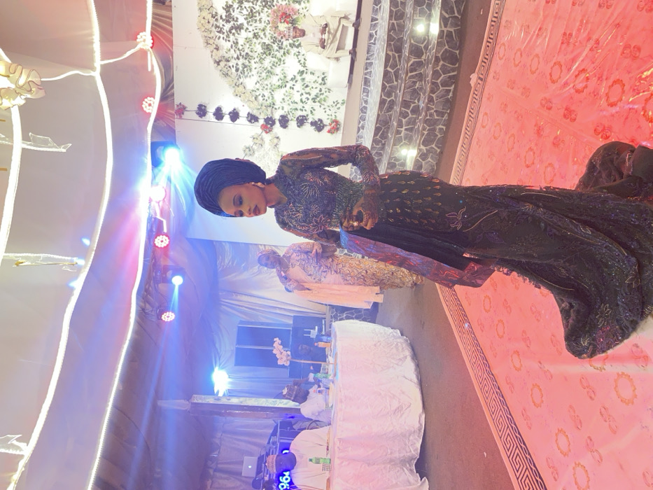 A woman in a dark, ornate gown and matching headwrap poses on a red-patterned stage. To the right, a tiered backdrop of gray stones leads to a floral arrangement. A second, lighter-skinned woman in a patterned beige gown stands behind her. A white-clothed table with flowers sits to the left, illuminated by blue and white lights. The background features white drapery and strings of lights. The scene is vibrant and festive, possibly at a wedding or formal event.