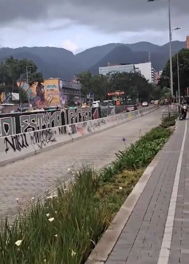 street scene in a city, possibly in a mountainous region, on a cloudy day. The camera is held steady, providing a static shot of the environment. In the foreground, there's a paved pedestrian walkway with gray and white bricks. To the left of the walkway, there is a low concrete barrier covered in graffiti, separating the pedestrian area from a lower level, which looks like a street with a cobbled surface. Along the lower street, there are small patches of greenery with tall grass and a few flowers. In the background, there are buildings of varying heights and designs, including some with colorful murals. Trees are interspersed among the buildings. Further back, mountains rise up, their peaks partially obscured by the low-hanging clouds. Cars and buses are visible on the lower street. There are also street lights visible on the right side of the frame.