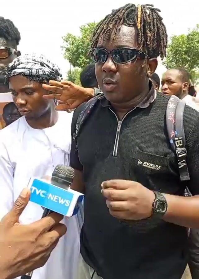 A man with dreadlocks and sunglasses is being interviewed by a reporter holding a microphone with the TVC NEWS logo. The man is wearing a black shirt with a zipper and a backpack. He is surrounded by other people, some of whom are holding a white banner with black lettering. The environment appears to be outdoors, with trees visible in the background.