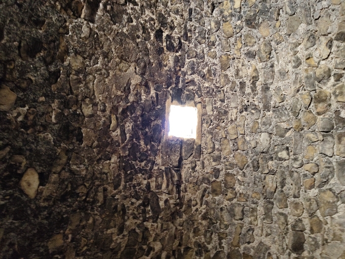 The image displays the interior of a stone-built architectural chamber, presumed to be located within the Mate Yehuda Regional Council, Israel. The scene is dominated by rough-hewn, irregularly shaped stones forming the wall and a partially visible arched or domed ceiling. These stones vary in size, shape, and coloration, ranging from dark grey to light beige, with visible mortar lines binding them. The surface texture is rugged and uneven. A single, small, rectangular opening is positioned in the upper center of the frame, acting as the sole light source. This opening emits intense white light, creating high contrast with the predominantly shadowed stone work of the interior. No individuals, furniture, or other distinct objects are present within the frame. The overall environment suggests an ancient or historically preserved construction.