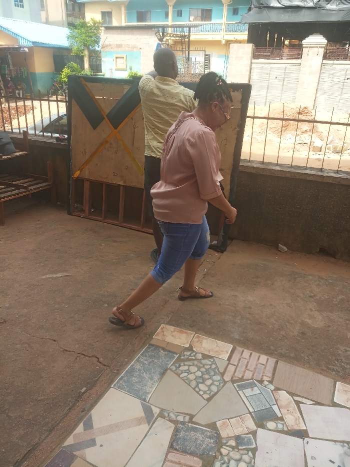 An outdoor scene in Onitsha, Nigeria, depicts two individuals moving a large wooden panel during daylight
