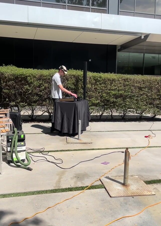 n outdoor event. At the start, a man in a hat is DJing near a hedge, using a table covered with a black tablecloth. There is a vacuum cleaner next to the DJ booth. The camera pans out to reveal a group of people gathered in front of a table under a tent, with a man talking into a microphone. Some of the group members wear athletic wear. Another man stands in the foreground with his arms crossed, talking to another man. Buildings are visible in the background. The weather appears sunny and bright.