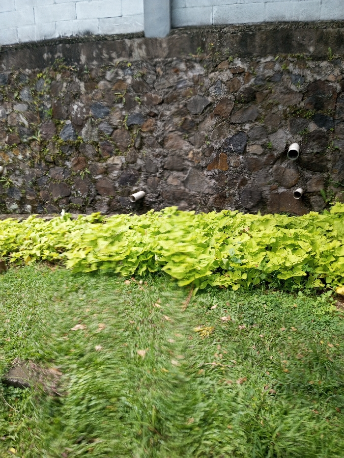 The image depicts an outdoor, ground-level scene in the city of Batulawang, Indonesia. The upper portion of the frame features a grey concrete block wall positioned above a dark concrete foundation. Below this structure, a retaining wall composed of dark, irregularly shaped stones with visible mortar lines dominates the mid-background. Small patches of moss and minor vegetation growth are present on the stone wall's surface. Three light-colored PVC drainage pipes protrude from the stone wall: one is situated on the left, and two are diagonally placed on the right. Directly in front of the stone wall, a dense, continuous bed of vivid light-green, broad-leafed ground cover plants extends horizontally across the image. The foreground consists of green grass, which exhibits significant motion blur, indicating movement during image capture. Scattered dry leaves are visible within the grassy area. No individuals, animals, or explicit actions are present in the scene.
